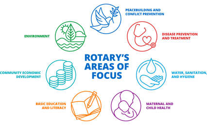 Rotary International's seven Areas of Focus (below) are carried out within the Avenues of Service portfolios and also can be funded through the Rotary Foundation which was established over 100 years ago.