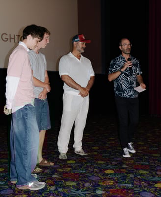 (Pictured below) At the Festival Launch on Friday 9th January 2026 at Rosebud Cinema: Short film winners are congratulated by Club Member Chris, supported by Festival Director Steve Bastoni.